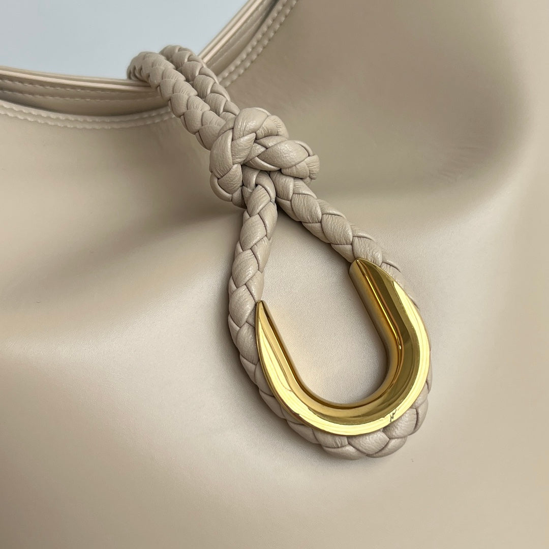 * Unique closure featuring a woven knot and horseshoe buckle metal ring.