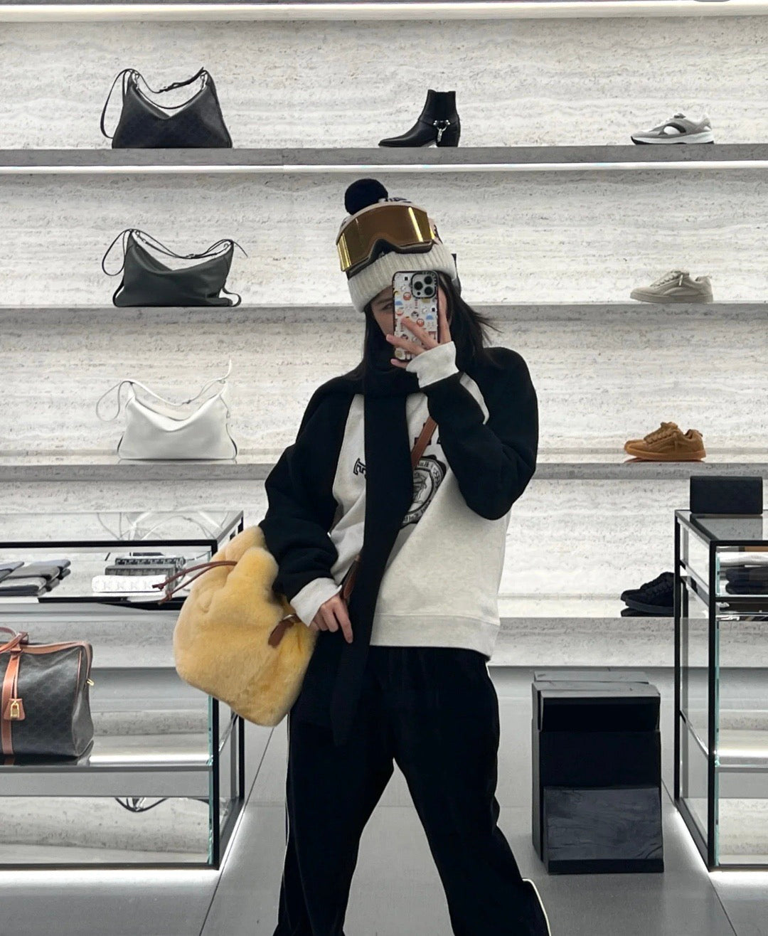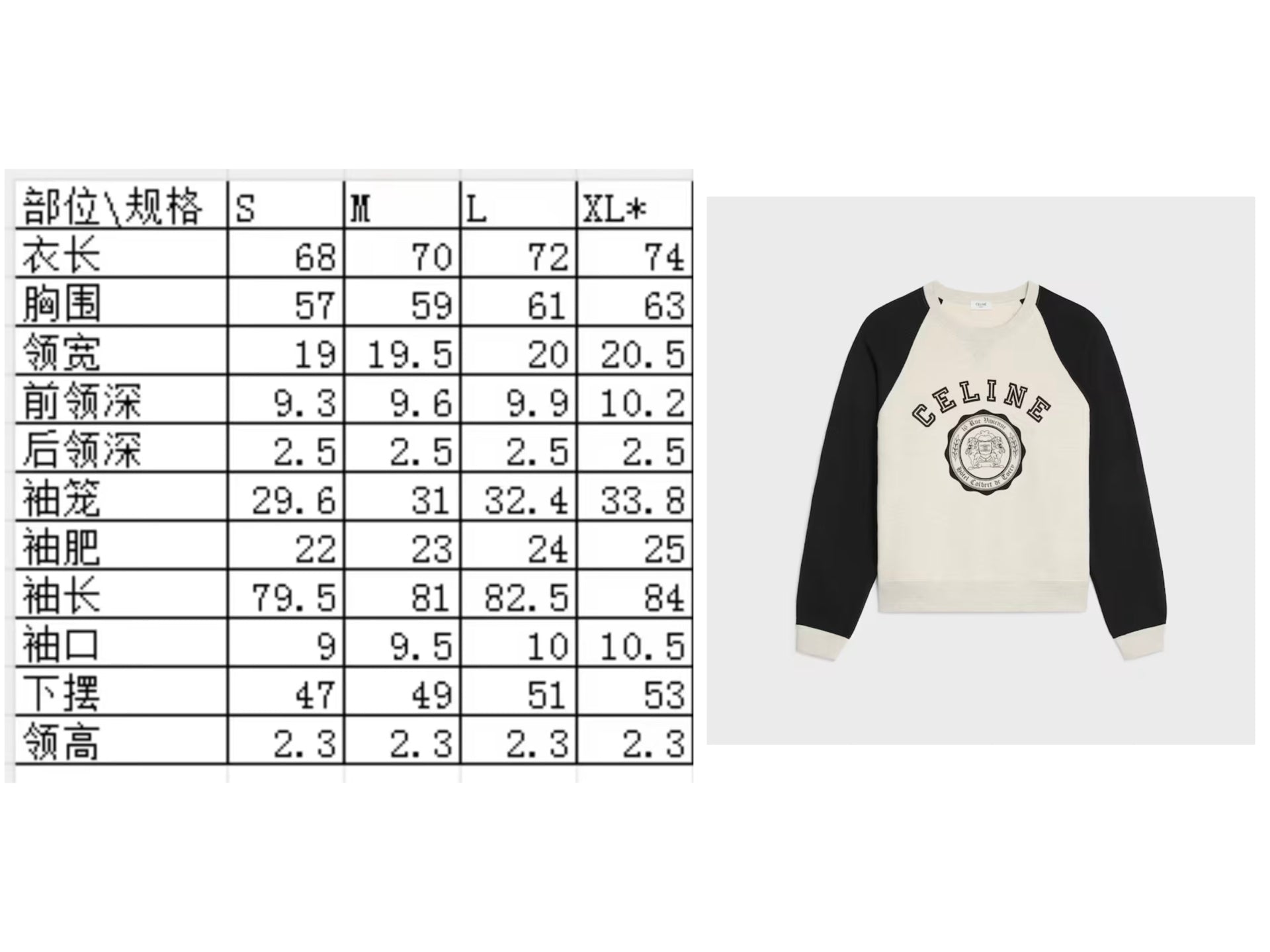 * Distinctive color-block design with a beige body and contrasting black sleeves, finished with beige cuffs.