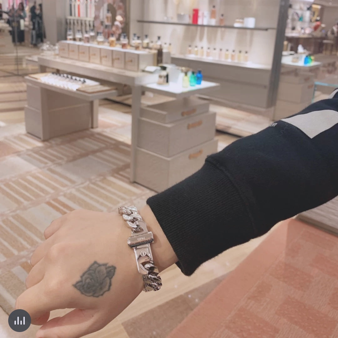 Crafted from premium stainless steel, this bracelet features an original steel-stamped logo clasp, ensuring a boutique-grade finish. Its modern minimalist aesthetic reinterprets classic design with meticulous attention to detail.