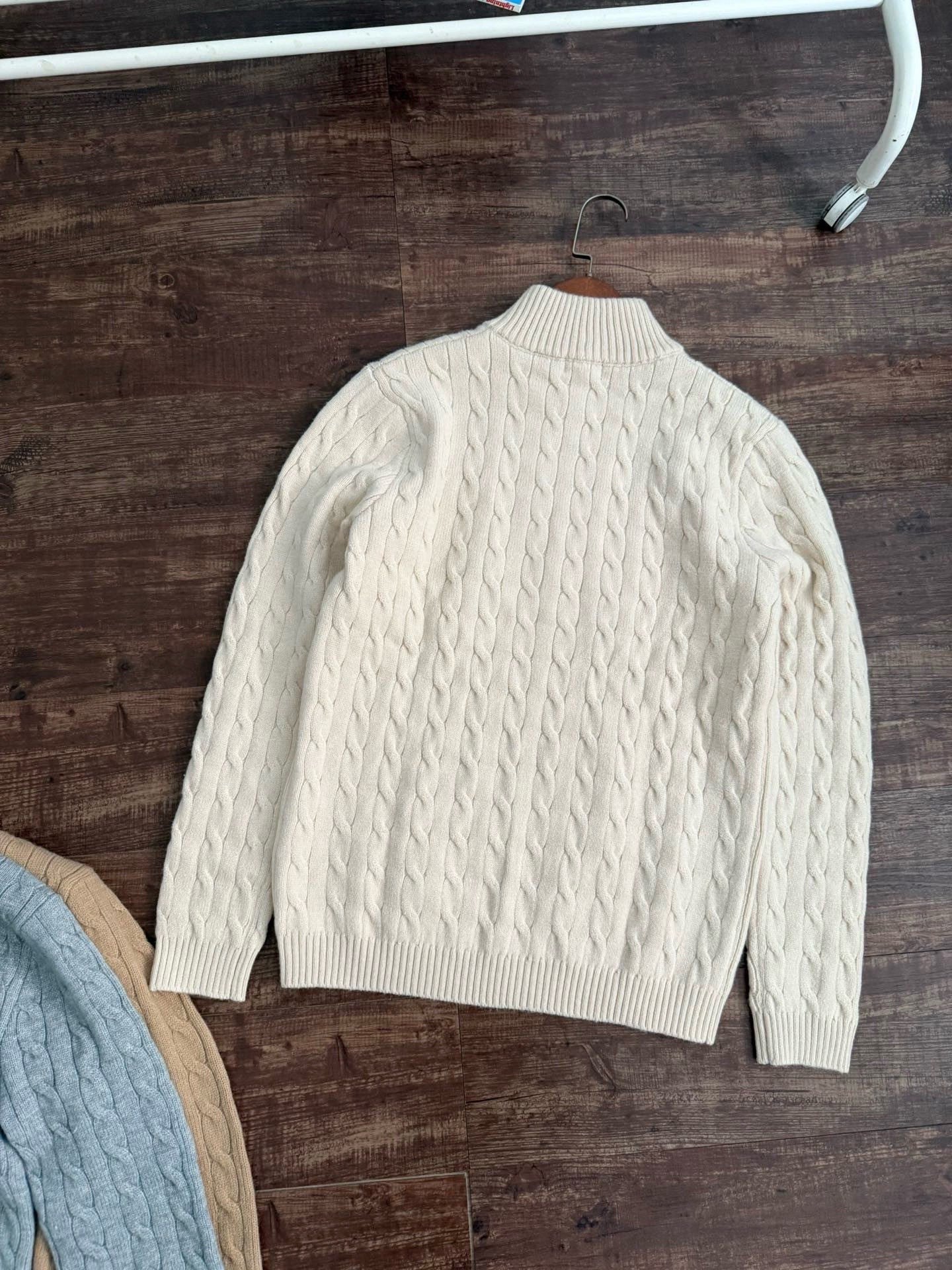 * Classic cable knit design enhanced with a refined leather zipper pull.