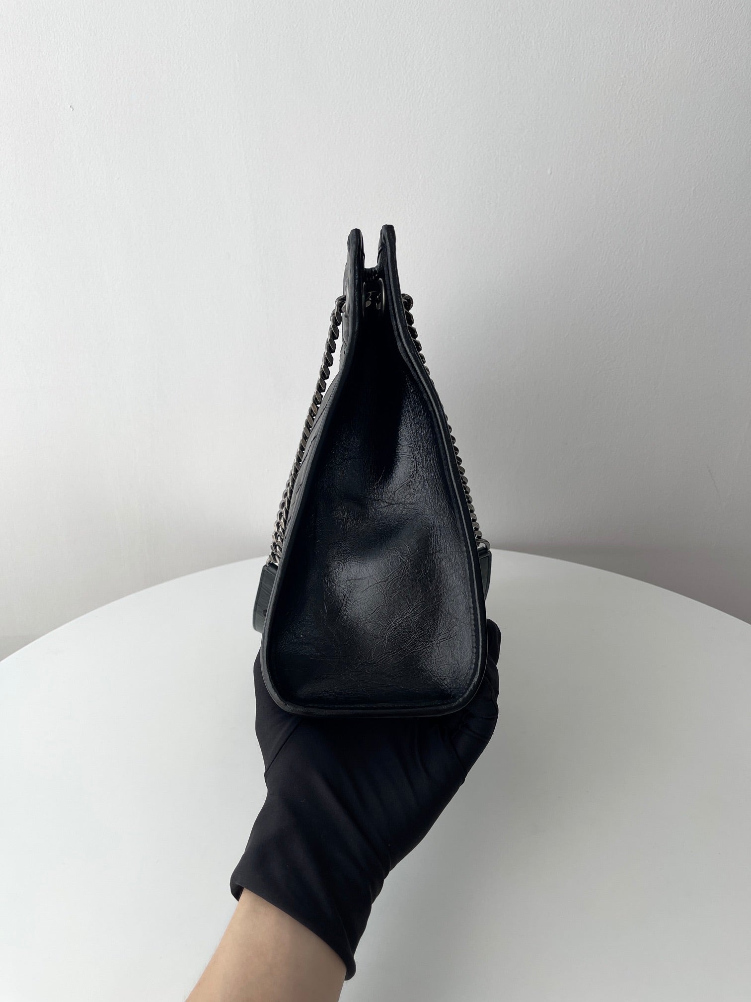 Crafted from premium crinkled oiled waxed calfskin leather, this piece embodies Saint Laurent's iconic Niki aesthetic. The logo is meticulously wrapped in genuine leather, reflecting a commitment to boutique-grade craftsmanship.