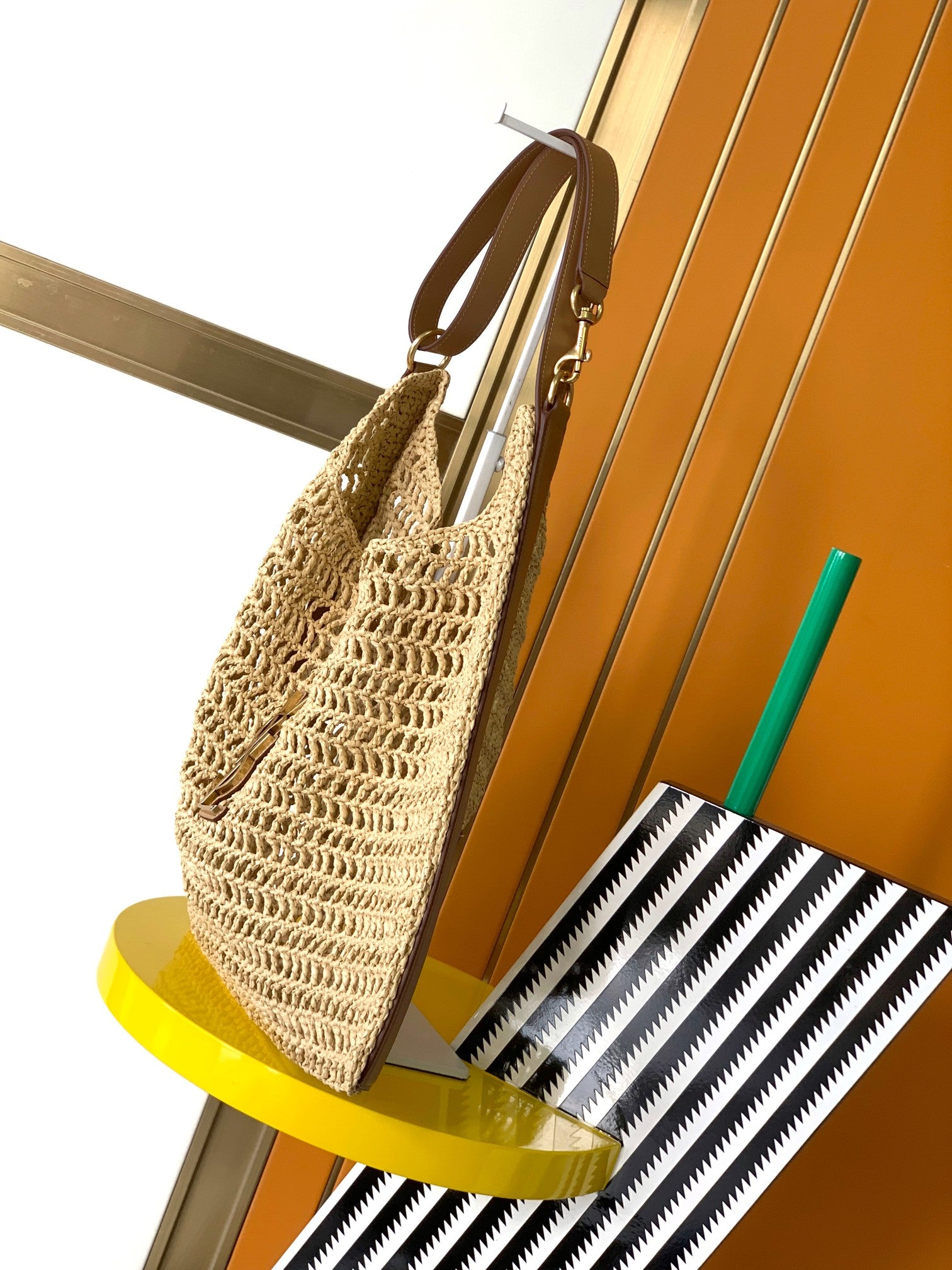 Meticulously crafted from natural raffia crochet and vegetable-tanned leather, this piece reflects exceptional boutique-grade artistry and premium material sourcing.